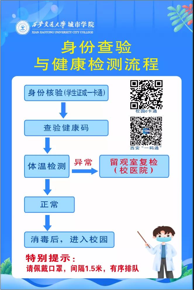 严禁学生提前返校,教职工在入校时,需扫描“西安一码通”二维码,凭绿码、校园卡,测温后进校。