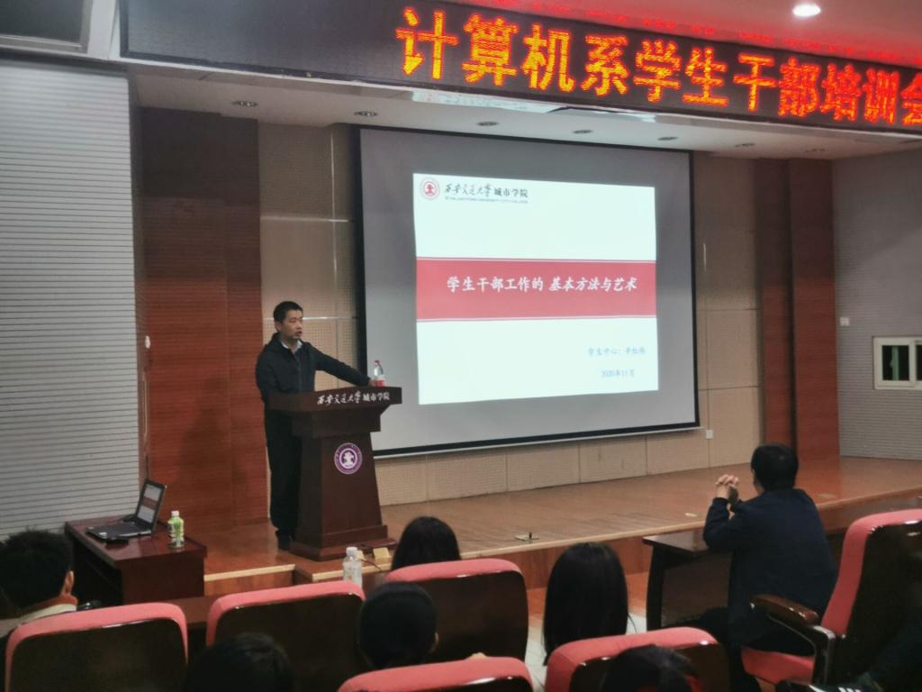 为进一步提高学生干部的工作能力与水平,计算机系于11月10日晚在教学楼F100组织举行计算机系学生干部培训第二讲,学院学生服务中心副主任辛红伟担任主讲人。计算机系学工办全体辅导员与2019级、2020级全体学生干部参加培训会,培训会由计算机系学生工作主管刘敏涛主持。