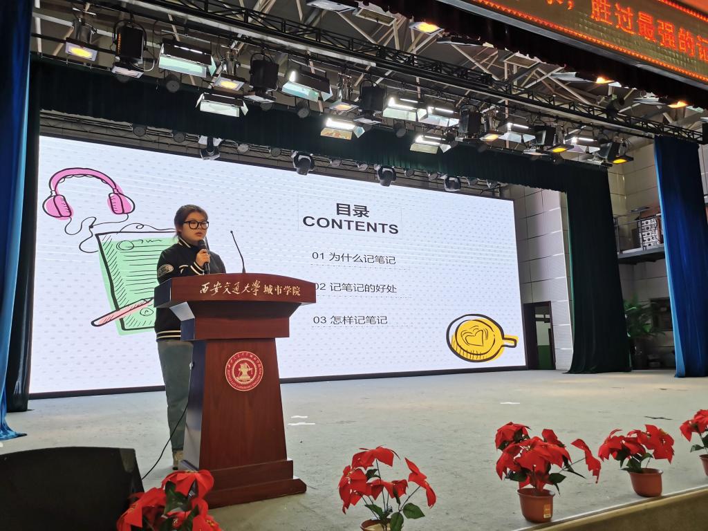 活动第二项学生代表贾艳同学发言,她从自身学习以及笔记誊写经验出发,告诉同学们做笔记的重要性,她认为,通过做笔记对书上的知识有更透彻的了解,并且不断培养自己的自学能力,通过做笔记对课上的知识进行总结,把知识内容串联成体系,便于记忆和理解。