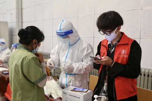 此次核酸检测离不开学生志愿者们的辛苦付出。19日上午11时接到核酸检测工作安排,学院团委12时便集结50名志愿者在大学生活动中心进行前期布场。1时10分,40余名志愿者上岗,从下午14时至晚间23时,在活动中心楼梯间、检测场地均能看到志愿者们忙碌而暖心的身影。