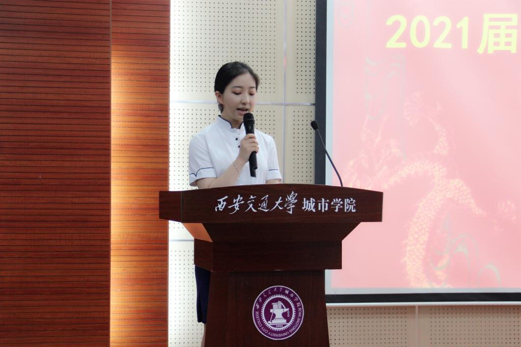 岳华海副院长宣读《关于聘任胡江波等76名同学为学院2021届毕业生校友联络员的决定》,并向即将离校的校友联络员送上了美好的祝福。陈光德院长为校友联络员颁发聘书,并合影留念。外语系英语专业毕业生冯乐怡代表2021届校友联络员发言,她感谢母校的四年培养,表示将传承“尚德笃学,守正创新”的校训,和城院精神,发挥好校友和母校沟通联络的桥梁作用,认真工作,实现自我价值,为母校增光添彩。
