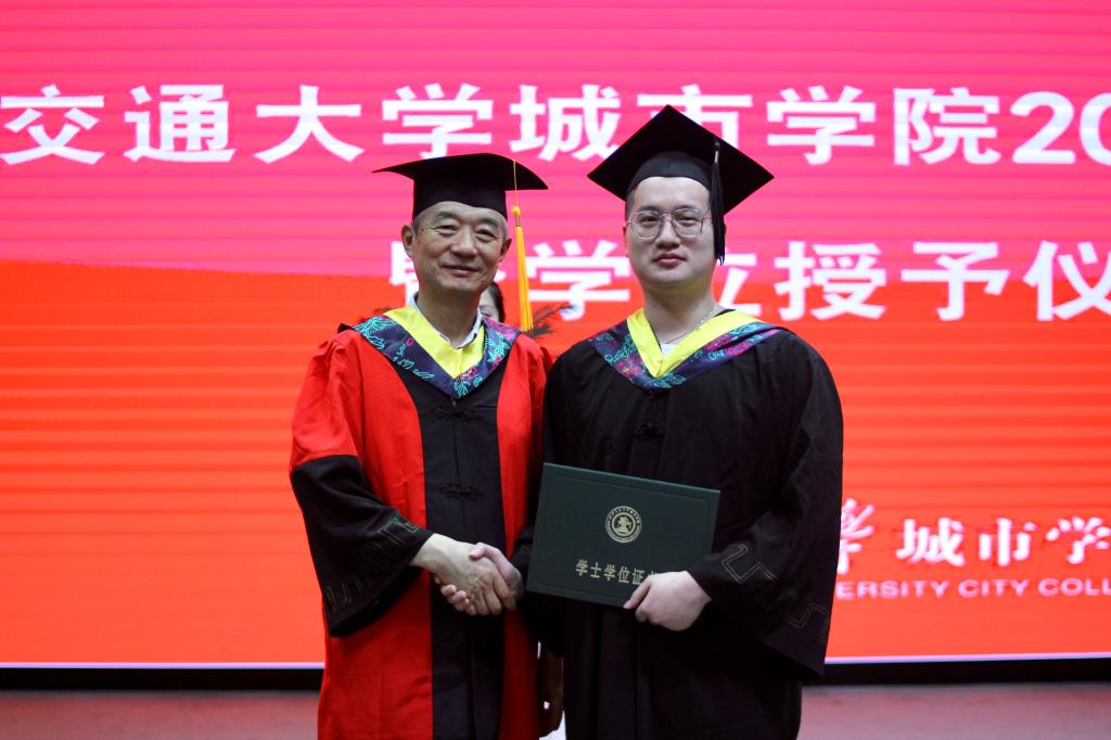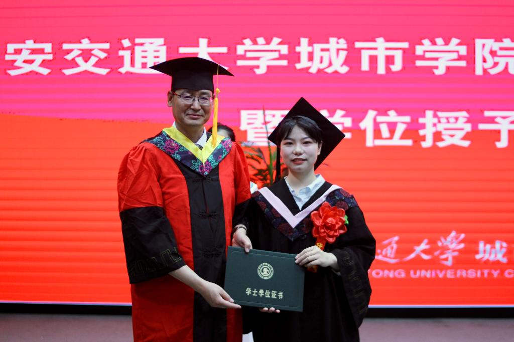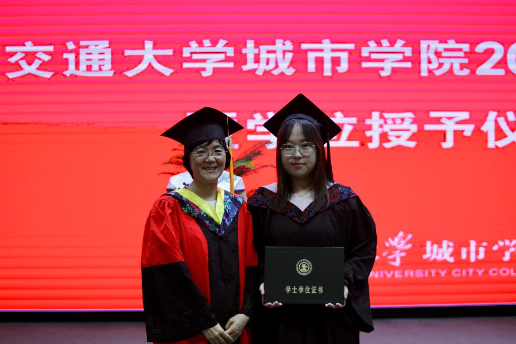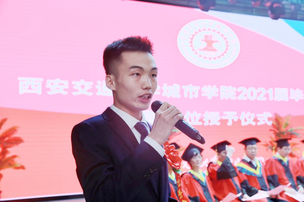 在艺术系国画171班董乐乐同学、金融172班张璐同学的带领下,全体毕业生集体进行宣誓:铭记尚德笃学,坚持守正创新;感恩父母养育,谨遵师长教诲;勇担时代使命,争做社会精英;肩负公民责任,报效祖国人民;为国家繁荣富强努力奋斗,让明日的交大城院以我为荣!大家声音洪亮,场面庄严而隆重。