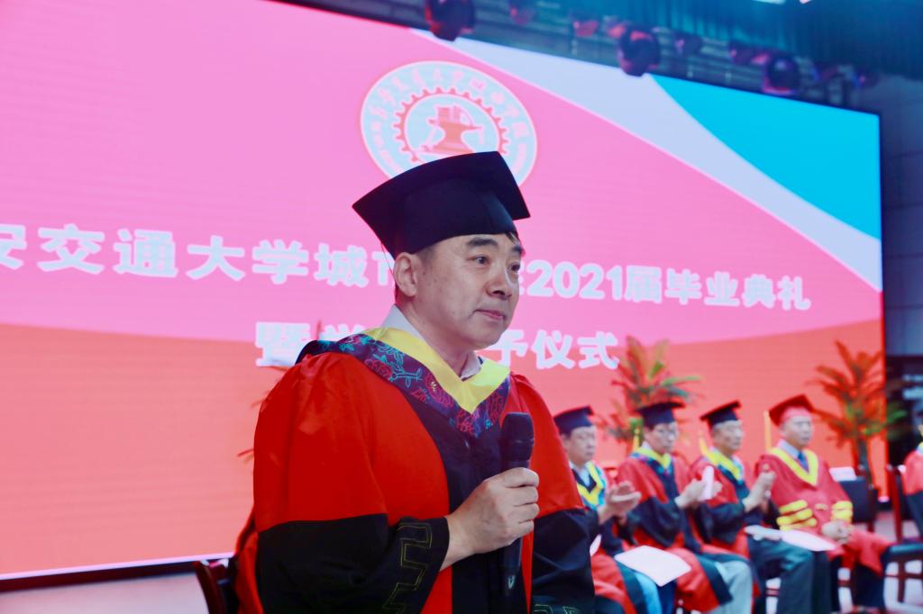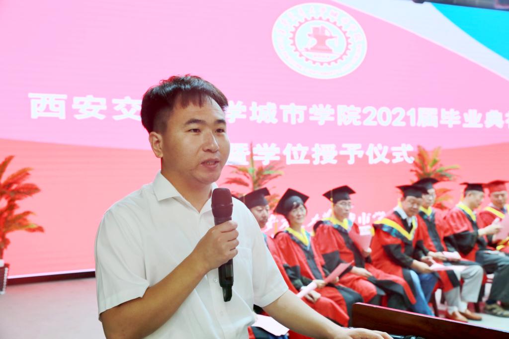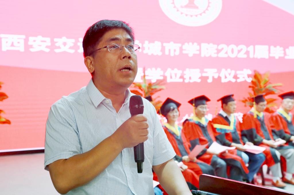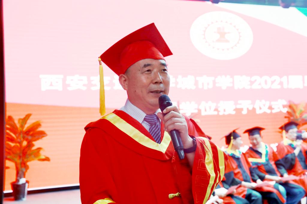陈光德院长深情发表了讲话,与毕业生一起回顾了大学四年里的点滴收获、成长和遗憾。毕业生们与学院一同走过的这四年,也是学院各项事业稳步发展的几年,学院的教育教学水平和办学质量不断提升,一直保持在了陕西和西北地区同类院校的排头兵位置,得到了社会各界的普遍认可。各位毕业生是学院发展的见证者,更是学院发展的参与者。陈院长同时感慨寄语毕业生,希望大家“厚植家国情怀,勇担时代重任”“共谱奋斗华章,不负青春韶华”“直面困难挑战,永葆生活热情”“常怀感恩之心,常念相助之人”。希望大家多关注母校、多支持母校、多给母校点赞、多回母校看看,无论离开多久,母校永远欢迎大家回家!在毕业生们即将开启人生新征程之际,陈院长衷心地希望毕业生们懂得感恩、学会感恩,怀有一颗善良的心,做一个有温度、有感恩情怀和行动的人!祝福2021届毕业生们身体健康、生活幸福、事业有成!