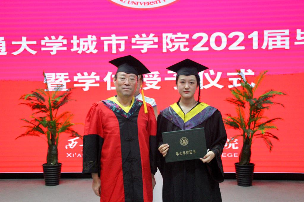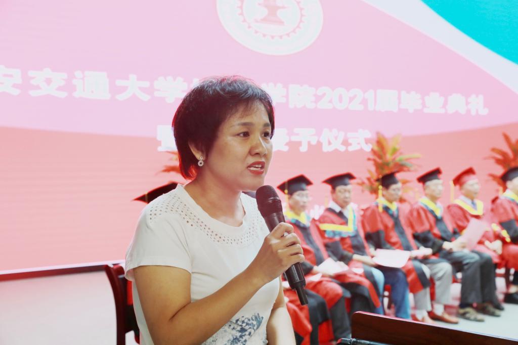 在庄严肃穆的国歌声中,大会正式开始。首先,朱旭副院长汇报2021届毕业生学业情况。2021届毕业生中,有2645人分别取得经济学、文学、理学、工学、管理学、艺术学学士学位,学位授予率为96.22%。朱旭副院长对顺利完成学业,获得本科学士学位的同学表示衷心的祝贺!截至目前,四百余名毕业生签约就业于国家税务总局陕西省税务局、国家广播电视总局、上海市监狱管理局、中国石油天然气股份有限公司、中国工商银行股份有限公司、中国移动通信集团公司、中国人寿保险(集团)公司、中国邮政集团有限公司、中国核工业第二二建设有限公司、中航飞机股份有限公司、中电太极(集团)有限公司、国网陕西省电力公司、陕西省地方电力(集团)有限公司、陕西省人民医院等世界500强和国有企业,有40名毕业生在国家机关和事业单位工作,有74名毕业生考取中南财经政法大学、重庆大学、西北农林科技大学、陕西师范大学等学校的研究生,有44名毕业生考取悉尼大学、昆士兰大学等国外院校的研究生,有5名学生参加“西部计划”。