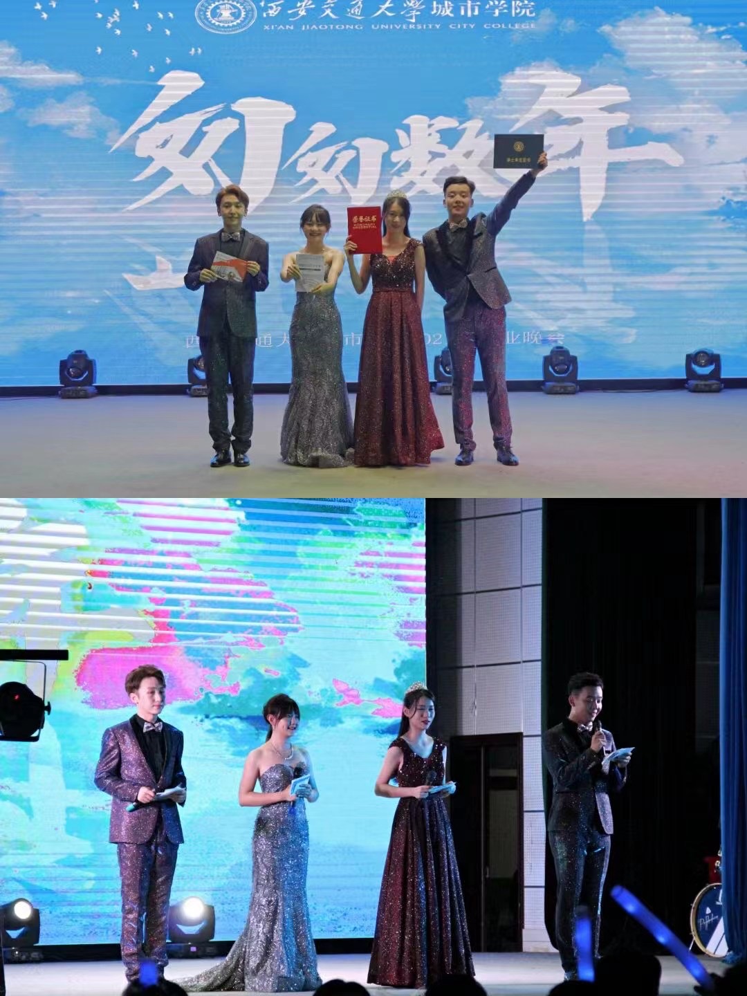 接着,李旭阳、罗兰等同学带来诗朗诵《城市之光》,以城市之光照亮青春,以青春之我点亮梦想,为母校朗诵出无悔的青春诗篇。接下来,全场观众跟随《城院新闻联播》一同回忆着校园那如水的日子,感受着生命中最为激荡的青春时光。晚会现场,全场观众更是沉浸在《西安人的歌》《无人的海边》《岁月神偷》《这世界那么多人》《讲不出再见》《我的未来式》等热歌辣舞中,感受着青春无悔的岁月,体会着古城西安带给我们的青春芳华。