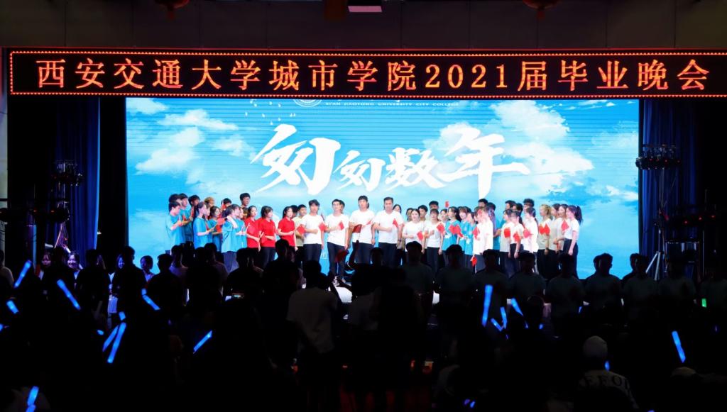 青春不散场 归来仍少年。2021届毕业晚会入场仪式在大学生活动中心楼下开展,学校领导、教师代表、宿管阿姨、后勤保障工作人员与2021届毕业生,分别在“我们毕业啦”签名墙合影留念,定格美好回忆。本次毕业晚会的演出节目均来自于校园征集和毕业生团队原创,既有“城院新闻联播”“毕业访谈”等新鲜面孔,也有歌曲、热舞、民乐等传统节目,并通过新媒体云平台实时直播,在线观看人数累计达8万余人,为2021届毕业生和家长朋友们带来一场属于这个夏天的视听盛宴。