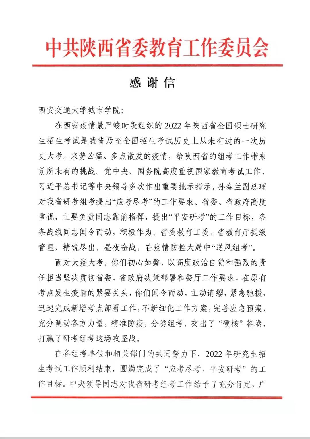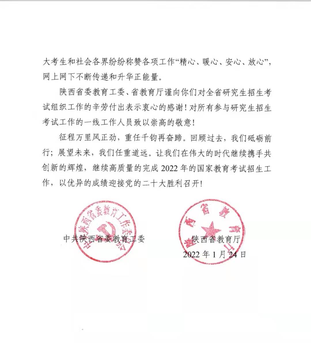 近日,学院收到陕西省教育工委、省教育厅感谢信,信中对学院在原有考点发生疫情的紧要关头,闻令而动,主动请缨,紧急驰援,充分调动各方力量,精准防疫,分类组考,打赢研考组考攻坚战表示肯定。对学院在全省研究生招生考试组织工作中的辛劳付出表示衷心的感谢!对所有参与研究生招生考试工作的一线工作人员致以崇高的敬意!