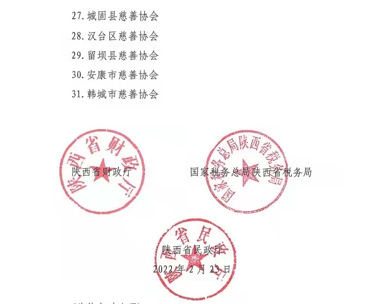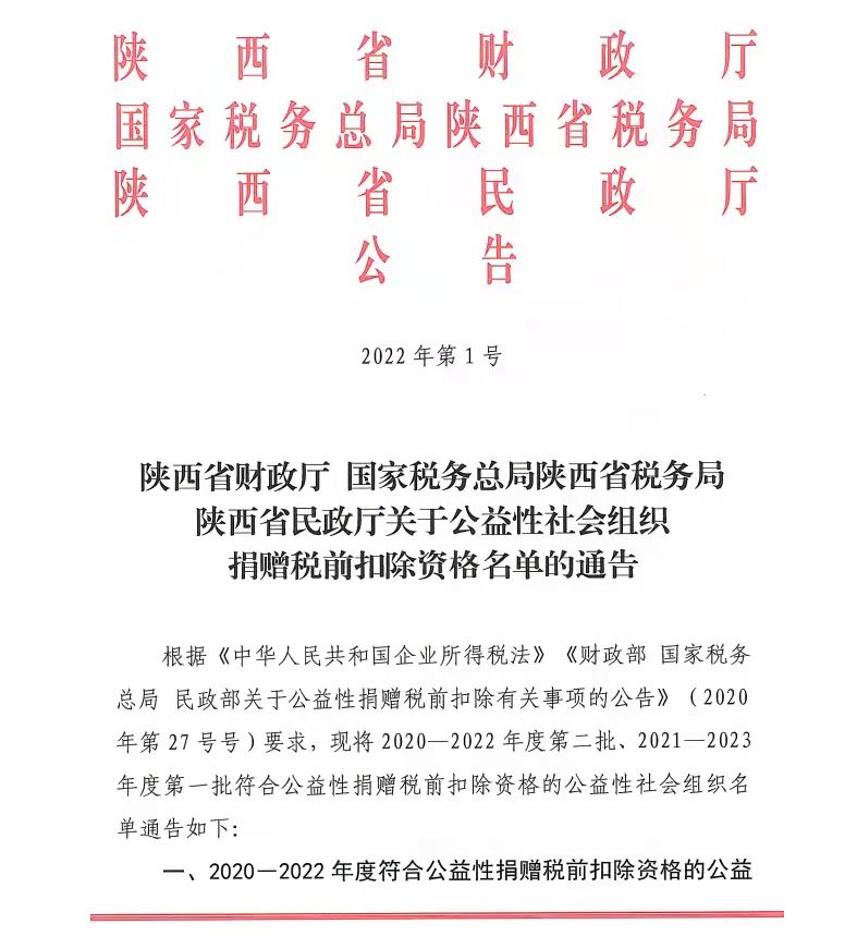 近日,陕西省财政厅、民政厅、国家税务总局陕西省税务局联合发布(2022年第1号)公告,公布获得2020-2022年度第二批公益性捐赠税前扣除资格的社会组织名单,我院教育基金会位列其中。至此,在2020-2022年向我院教育基金会进行公益性捐赠的企业、个人可进行税收抵扣。