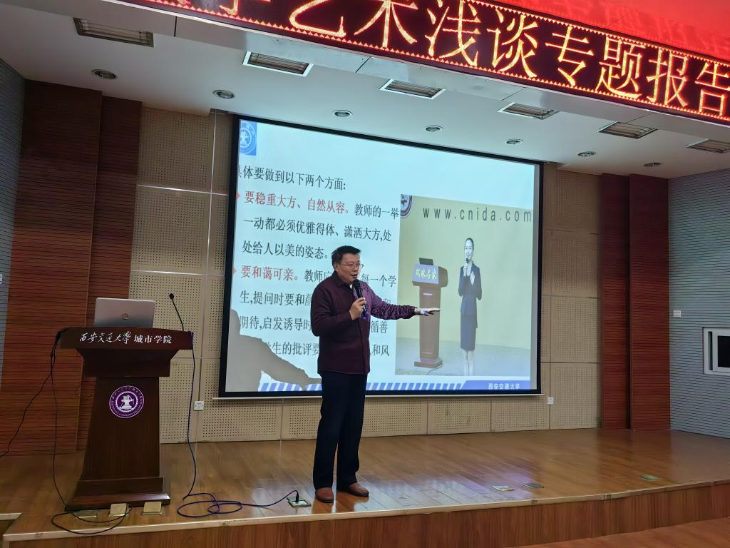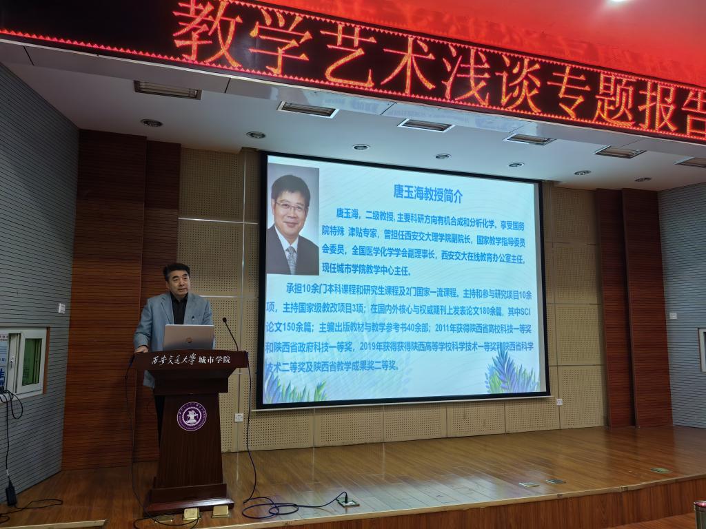 唐玉海教授结合自身授课经验,以“教学艺术浅谈”为主题,从教态、课前导入、讲授、组织、板书、结尾等六方面对教学艺术进行了深入讲解,理论联系实际,帮助教师们梳理了教学艺术的内涵,并通过举例子的方法从实践角度为教师们展示了实际教学情境中具体的运用,参会教师们纷纷表示获益匪浅。