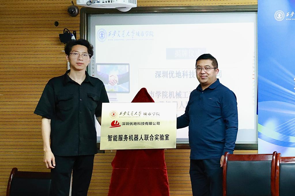 校企合作现场签约环节,学校部分二级学院与企业代表签署了校企合作协议。随后,由机械工程学院与深圳优地科技有限公司负责人共同为“智能服务机器人校企联合实验室”揭牌。