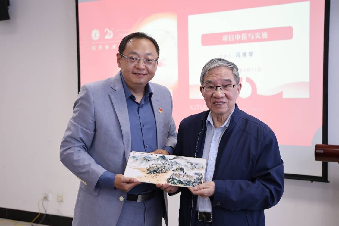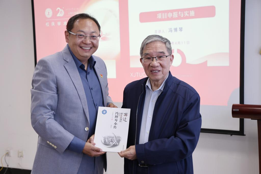 报告结束后,张爱萍书记向冯博琴教授敬献校庆20周年贺礼——山水瓷画,冯博琴教授回赠了著作《西迁创业者列传——冯博琴小传》。