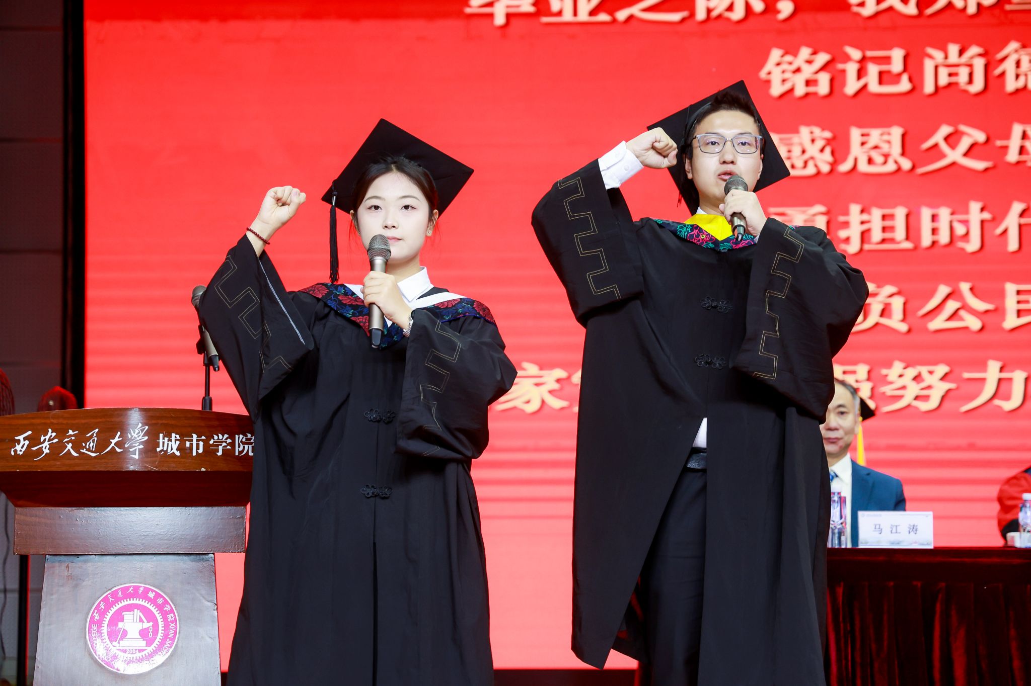 在英国上市365官网物联网2101班熊晨、护理与康复学院护理2102班王欣同学的带领下,全体毕业生进行宣誓。