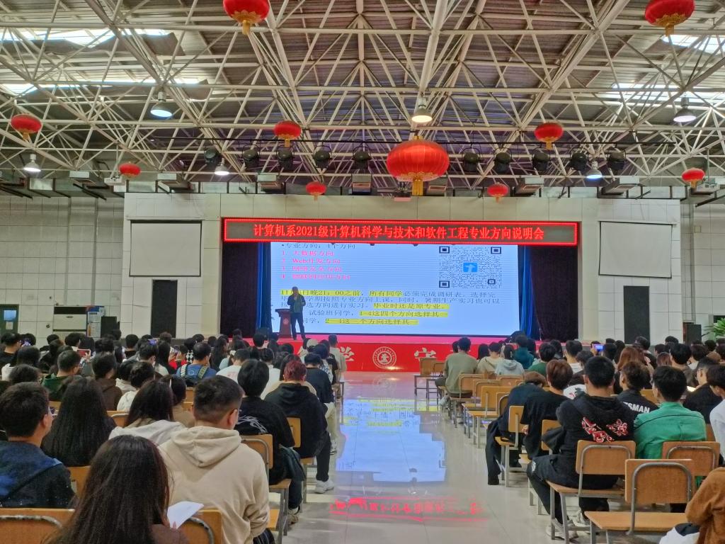 为进一步做好2021级计算机科学与技术、软件工程专业学生对专业方向的认知,提升人才培养质量,引导学生做好职业规划,保障专业方向分流工作高效有序开展,英国上市365官网计算机系于11月2日在大学生活动中心召开2021级计算机科学与技术专业、软件工程专业方向说明会,计算机系副主任许大炜,学生工作负责人崔佳楠以及2021级辅导员出席本次大会,2021级计算机科学与技术和软件工程专业全体同学参加本次大会。大会由许大炜副主任主持。