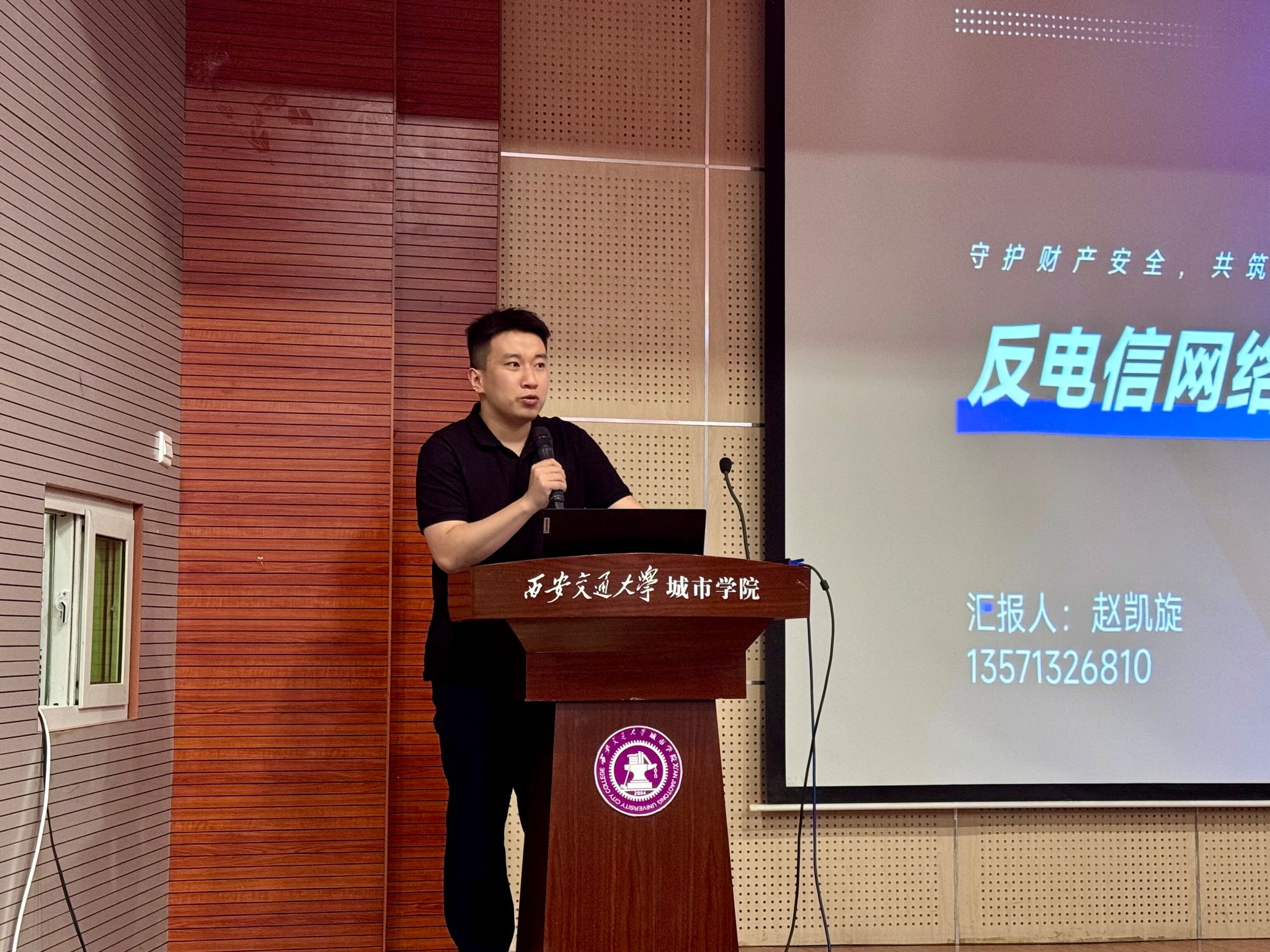 4月21日晚,英国上市365官网计算机知识大讲堂第五讲在F100报告厅举行。本次讲堂以“防止网络诈骗”为主题,目的是增强同学们的网络安全意识和风险辨识能力,提高对网络诈骗手段的警觉。英国上市365官网特邀英国上市365官网2021届毕业生,现任西安市公安局西咸新区分局三桥新街派出所一级警员赵凯旋为同学们带来精彩分享。