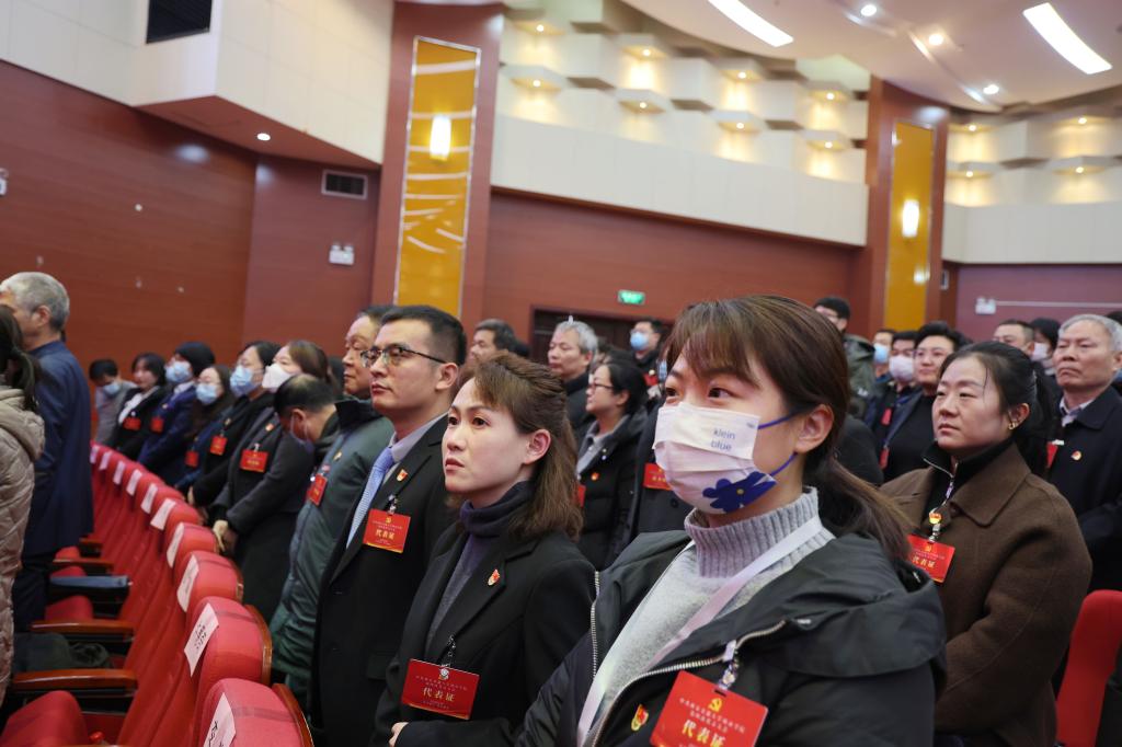 会场氛围庄重热烈。主席台上金色的党徽与十面鲜艳的红旗相映生辉。大会在雄壮的国歌声中拉开帷幕。随后,全体党员重温入党誓词。